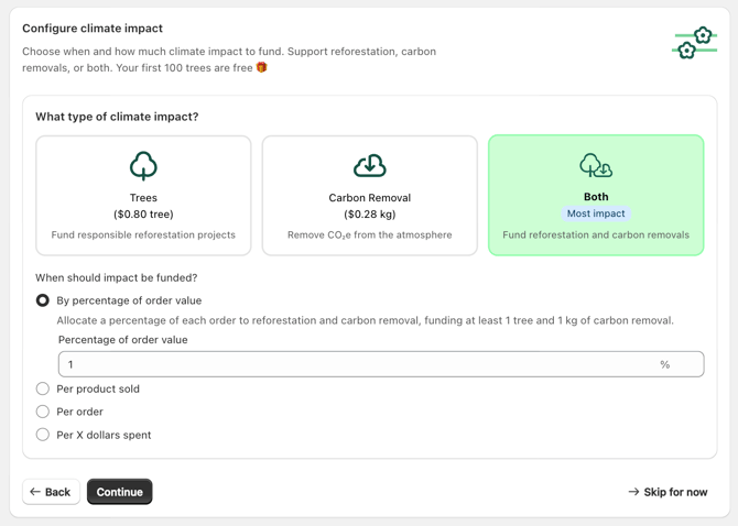 🌳 You're all set. Climate action is now live with the default setting of 1 tree per item sold. You'll be billed monthly via your Shopify invoice. You can customise your settings to fund carbon removals instead, or both trees and carbon removals together.