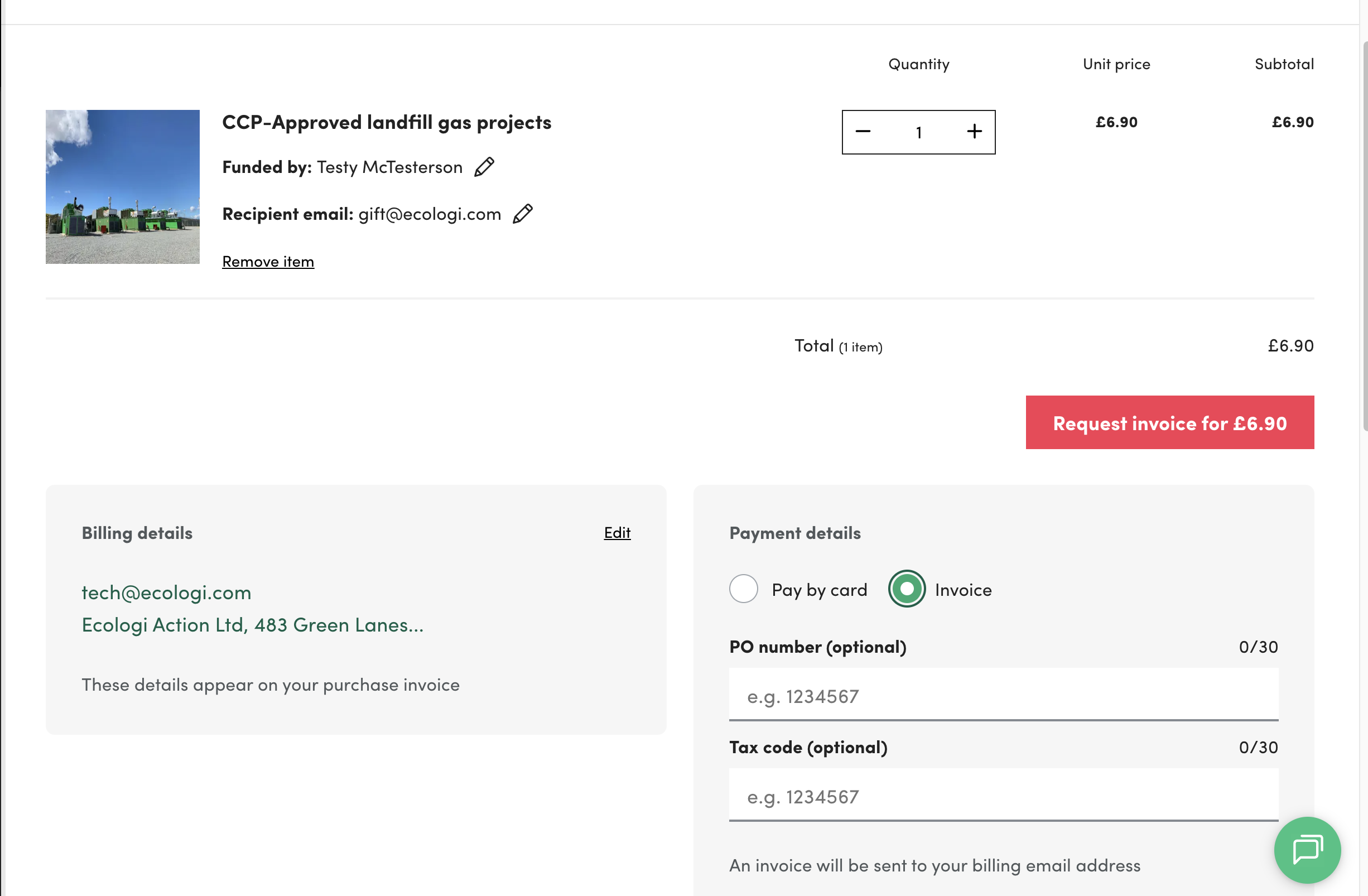• If you choose to pay by invoice, this will be sent to the billing address provided and should be paid within 30 days of issuance. The tile representing your impact will be added to your Ecologi profile as soon as the payment is received