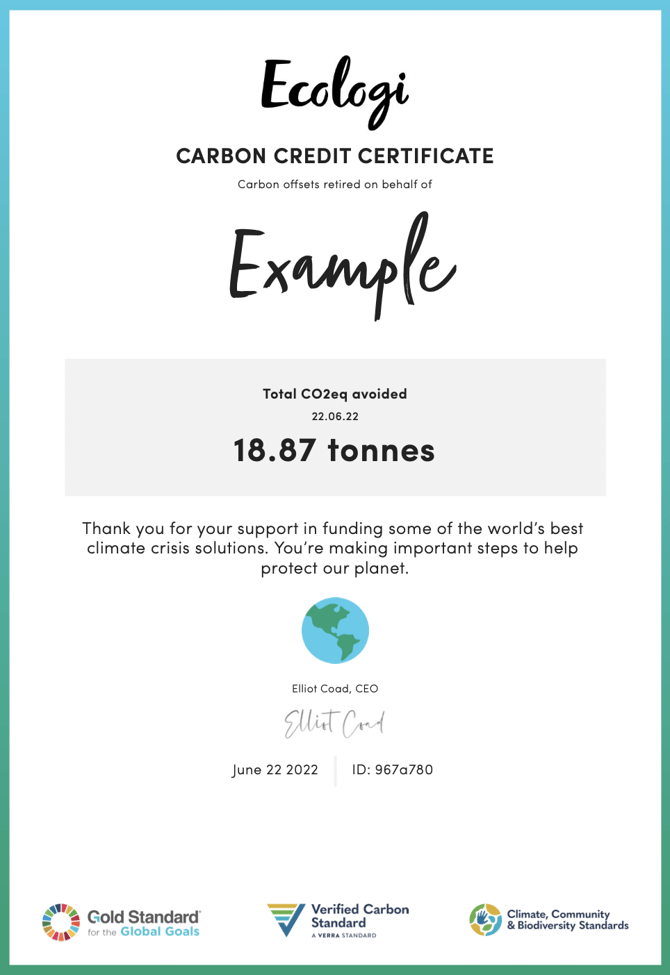 Certificates are available on-demand for the total carbon avoidance funded by your Ecologi account.